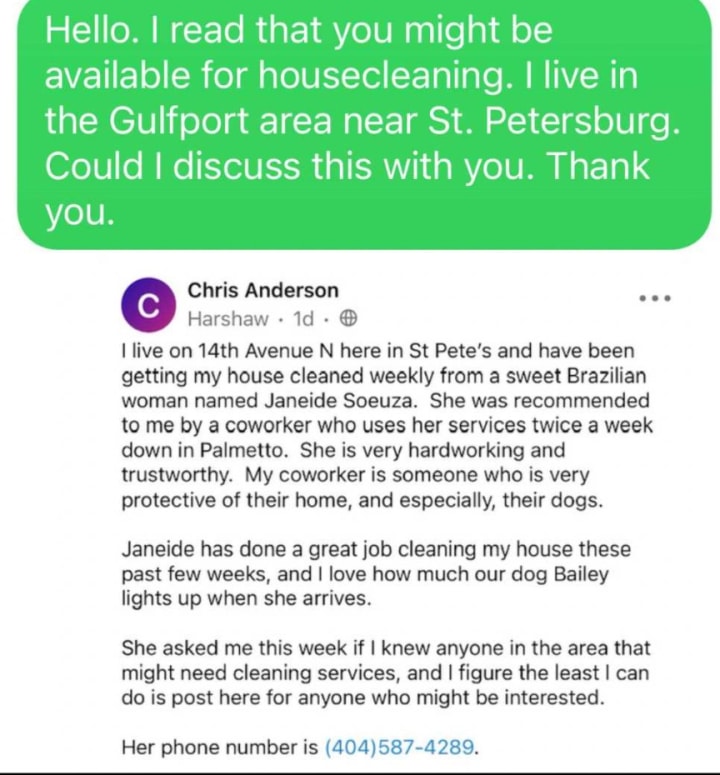 I highly recommend Janeide Batista and JS Cleaning Services for anyone looking for reliable, professional, and detail‑oriented cleaning in the Clearwater, St. Petersburg, and Tampa areas. With over 20 years of experience, Janeide brings a level of expertise and consistency that is hard to find.