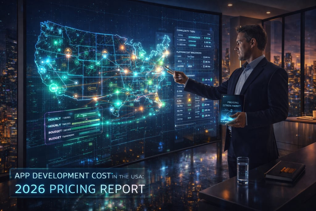 A business professional presenting the 2026 pricing report on app development costs across the USA, using a futuristic digital interface to illustrate regional data and complexity tiers.