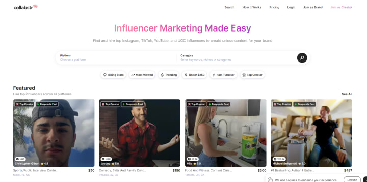 Collabstr is a self-serve influencer marketplace where creators list their rates and deliverables upfront. Brands can browse categories, view pricing, and instantly book collaborations without the need for negotiation.