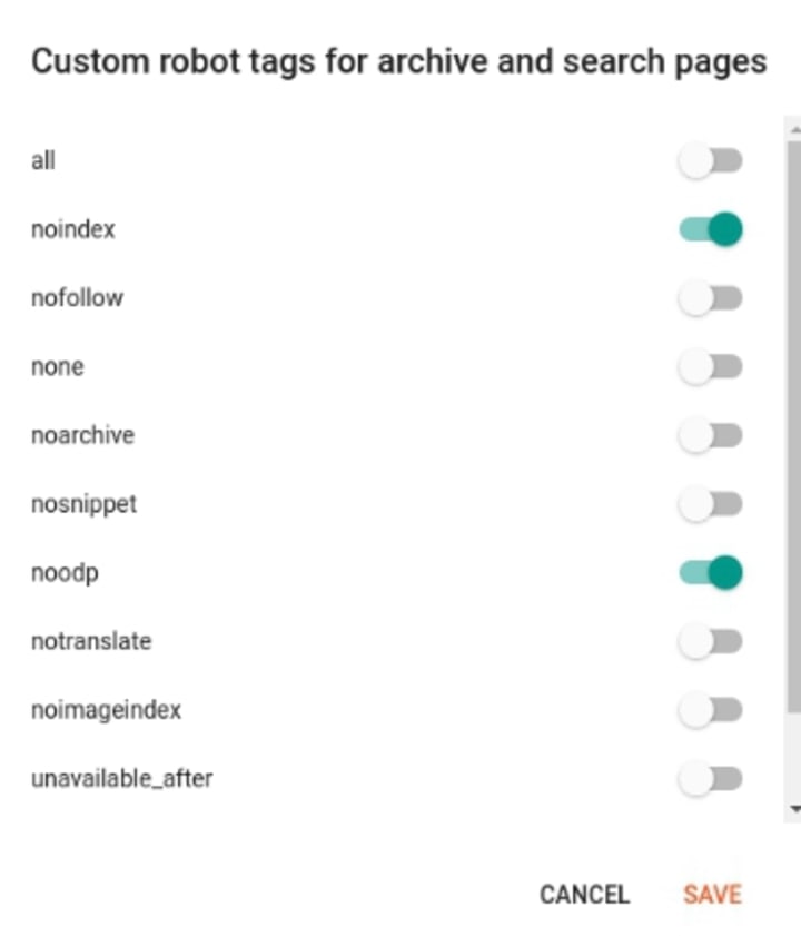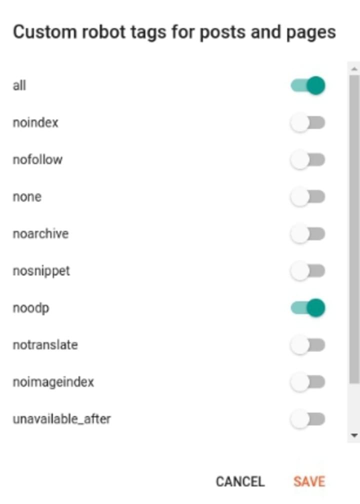 When you click on the tags for articles and pages, a tiny window with 10 tags will appear. turn on the all and noodp buttons, then select save