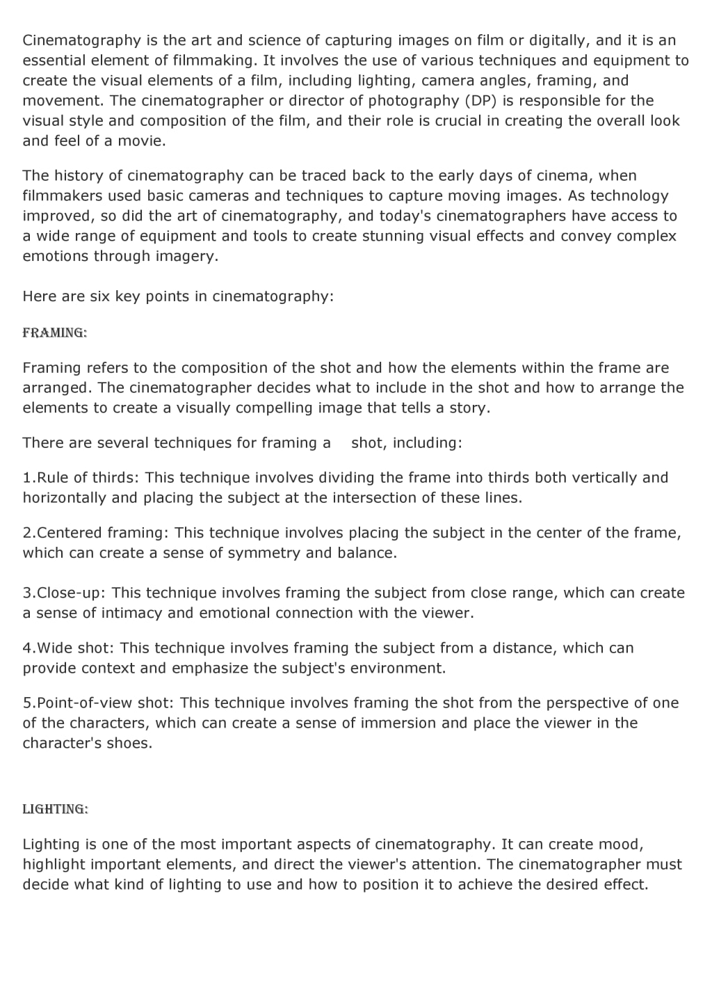 Cinematography is the art and science of capturing images on film or digitally, and it is an essential element of filmmaking. It involves the use of various techniques and equipment to create the visual elements of a film, including lighting, camera angles, framing, and movement. The cinematographer or director of photography (DP) is responsible for the visual style and composition of the film, and their role is crucial in creating the overall look and feel of a movie.