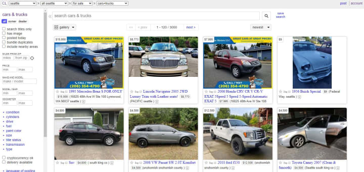 8) Cars: Craigslist is a very useful resource for anyone looking to buy a car in the Seattle area. You can find a good deal, whether it’s from an individual or from a dealership, and you can even sell your own car on there too.