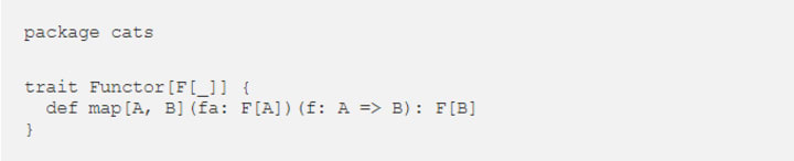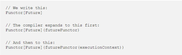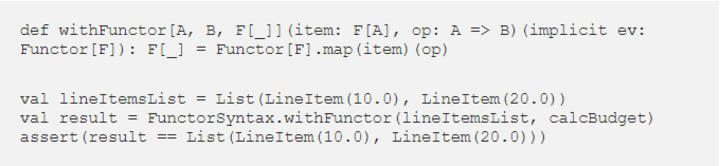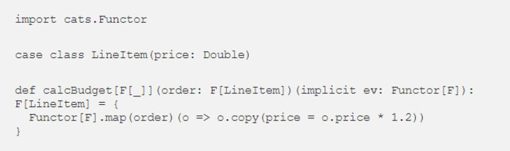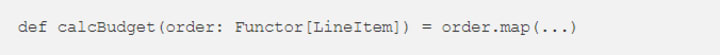 This concept is implemented using implicit classes and allows us to write order.map(...) instead of Functor[F].map(order)(...). We can also drop the implicit parameter by specifying that type F[_] is a Functor: