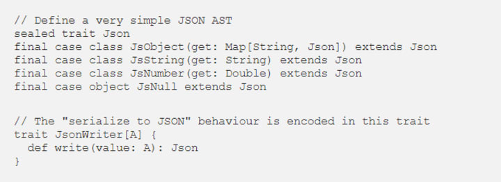 In Scala we define instances by creating concrete implementations of the type class and tagging them with the implicit keyword: