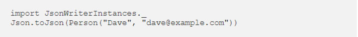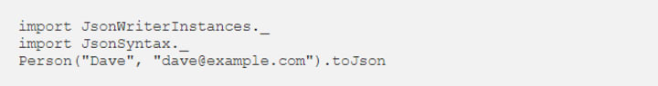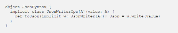 The compiler spots that we’ve called the toJson method without providing the implicit parameters. It tries to fix this by searching for type class instances of the relevant types and inserting them at the call site:
