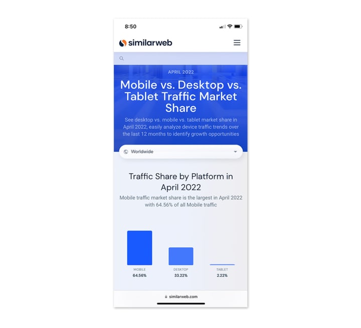 According to Similarweb, users surf the Internet more often using mobile data. For instance, in April 2022, the global mobile traffic was two times higher than the Desktop one.