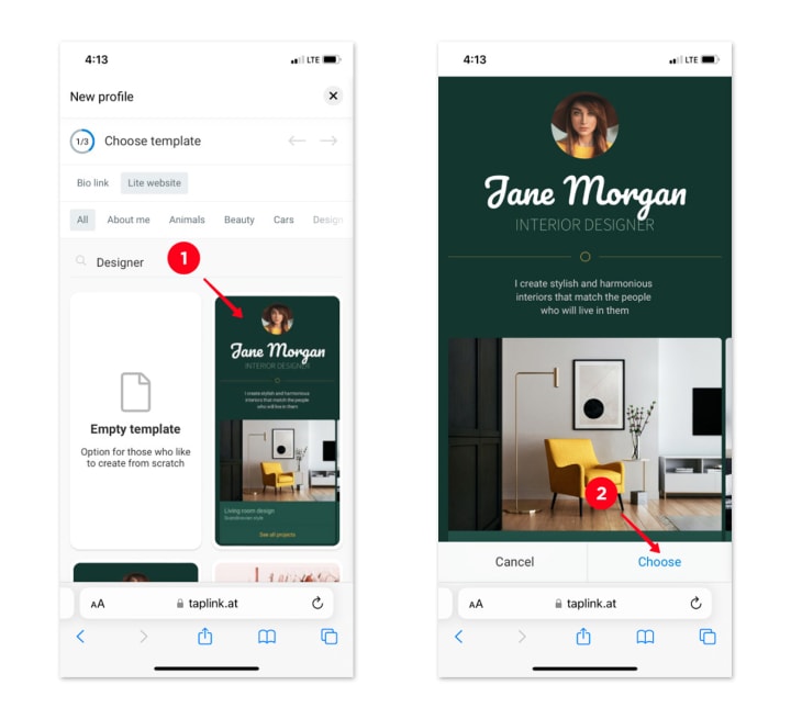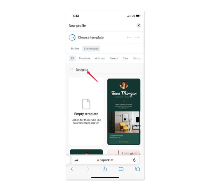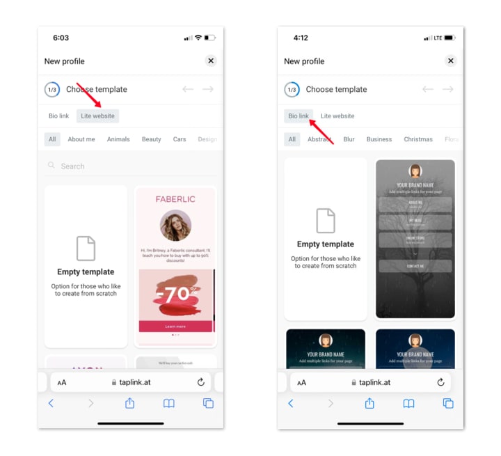 After that, you will see the page with premade templates. Look at the Lite Website section. Here, you can find more than 60 templates divided into 20 categories. These templates help you to create a stunning page within a couple of minutes. Near this section, you can find the Bio link tab. There are design options for pages with multiple links. As a rule, they’re used for leading followers from one social network to other links.