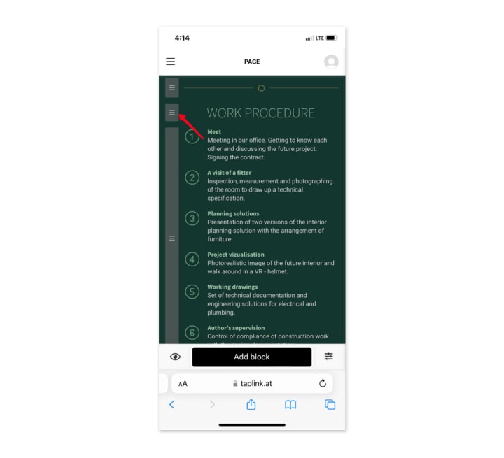 Shift elements. If you think that one of the elements doesn’t look good there, you can move it to another place. Just tap and hold the gray rectangle in the left part of the page, and drag it to another place on this page. That’s it.