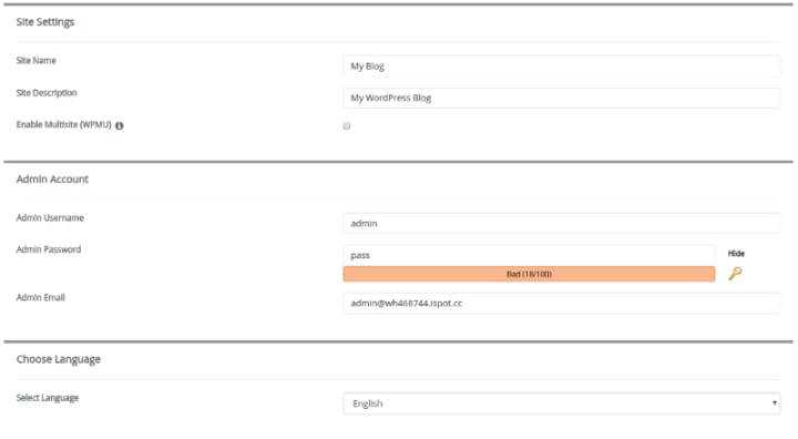 – Under Admin Account, choose the username and the password you want to use to log into your WordPress Dashboard.