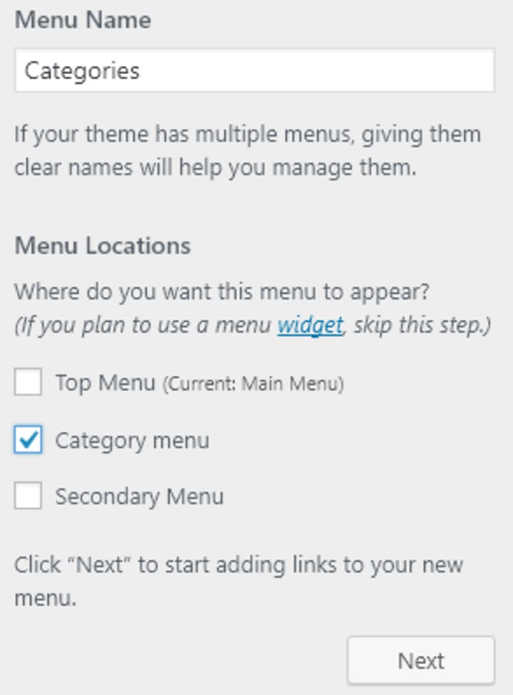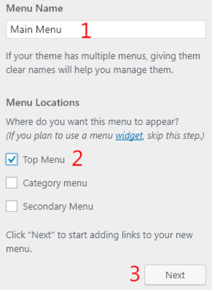 Under Menu Name, enter the name of the new menu, let's name it Main Menu. Let's also check the box Top Menu, and then click on Next.