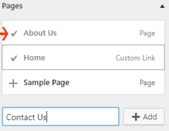 Let's add Home, About Us, and Contact Us pages to the Top Menu. Click on Add Items, and under pages click on + sign next to them to add them. If they don't exist, type the name of the page in the empty field and click Add.
