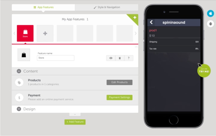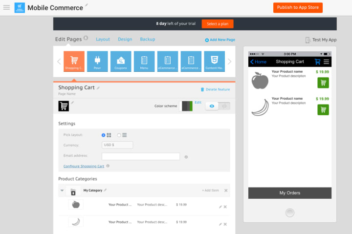 eCommerce is available as a separate tab in iBuildApp's feature list.Then you can use the builder to add an eCommerce section and start selling on mobile.The product pages are straightforward, with few choices (one single image, no products or variants).iBuildApp does not have features like abandoned cart management or advertising banners.Paypal is the only payment gateway available.Pricing starts at $ 24 / month with limited downloads. Reseller prices start at $ 395 / month.