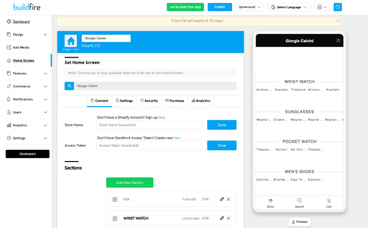 This segment is a Shopify integration when it comes to e-commerce.To use BuildFire for e-commerce, you must have a Shopify website.Push notifications are available, as well as Paypal and Stripe integration. The requirement to use a Shopify plugin complicates the store's setup.If your app has a broad user base, keep in mind that push notifications and downloads are both restricted.Pricing begins at $ 89 per month, plus the cost of a Shopify subscription (which starts at $ 29 per month).