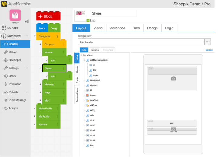 In 2011, AppMachine was created. Their base of operations It is organized around blocks (similar to Lego blocks), each of which represents a different function of the app.Each block manages its own content and design.very easy to use. Products can be imported and exported, and APIs can be used to integrate with other services.It's possible to publish on both Android and iOS, submit push notifications, promote the app with a QR code, and get comprehensive statistics.
