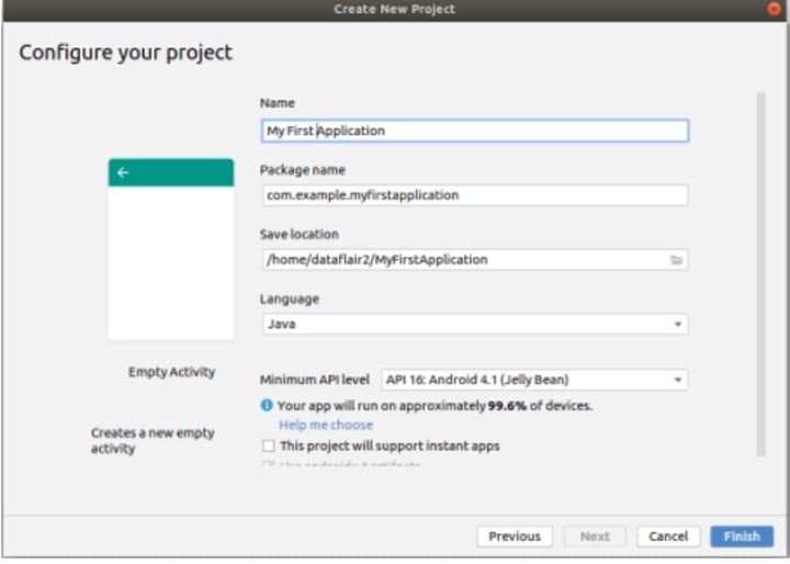 Now, we will name our application and choose the language. Then click on the Finish button.