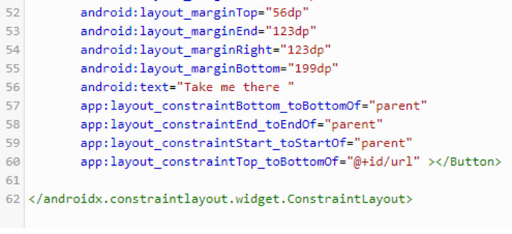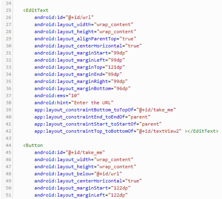 We can change the message that is written in the line: android:text= “Hello Everyone”. We’ll change it to “Hello Everyone, I’m here to take you to the URL to enter”.