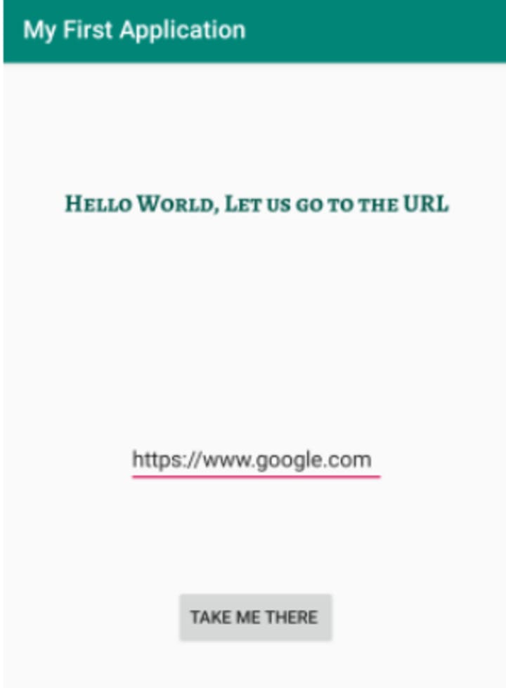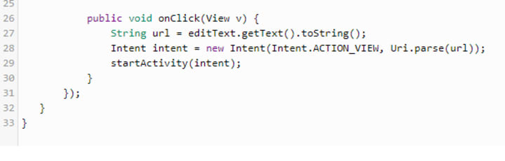 Now, we will write the code to implement the onClick() action of the button in the MainActivity.java file. The application that we are developing will take us to the respective URL. To implement this we will use Intents - Android Intent and Intent Filters.
