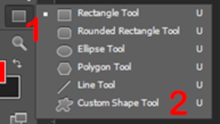 1. Open Photoshop. On the left side, click with your right mouse on the square shape and select Custom Shape Tool.