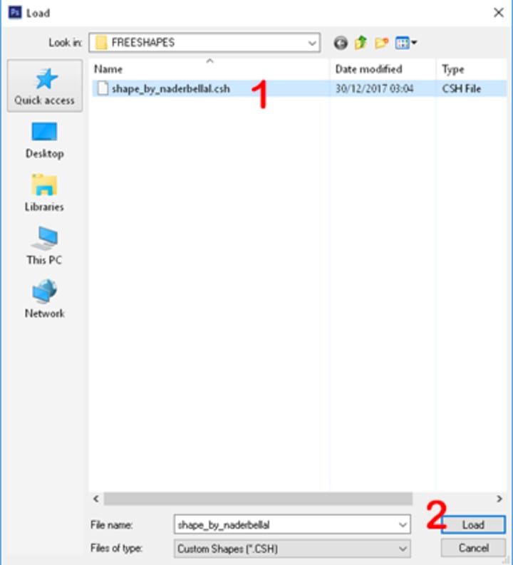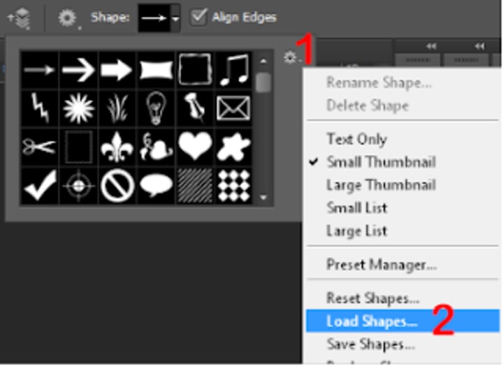 To make use of custom shapes, they must be installed into Photoshop as follows: