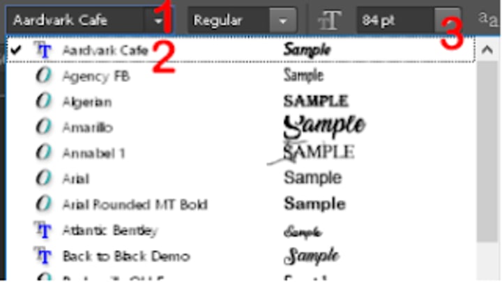 1. On the left side, click on Horizontal Type Tool, then on the top, select the font and its size.