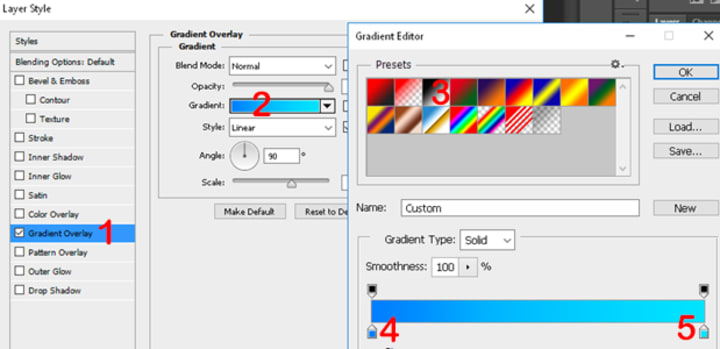 2. A new window will appear, activate Gradient Overlay, and click on the color next to Gradient. A new window will appear, select the third Preset and pick two varieties of the same color. The varieties should be very close to each other. See the following picture.