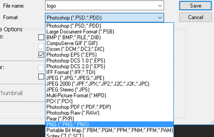 3. Next to File Name type the name of your logo, in the drop-down next to Format, select PNG, and click Save.