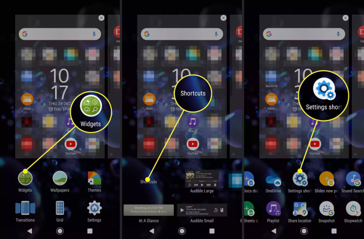 2. Scroll through the widgets menu and look for the Settings option. If you find it, drag it to the home screen and select it.