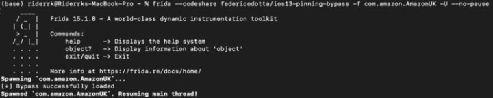 Step 2:- Now Run the command frida–codeshare federicodotta/ios13-pinning-bypass -f -U –no-pause.