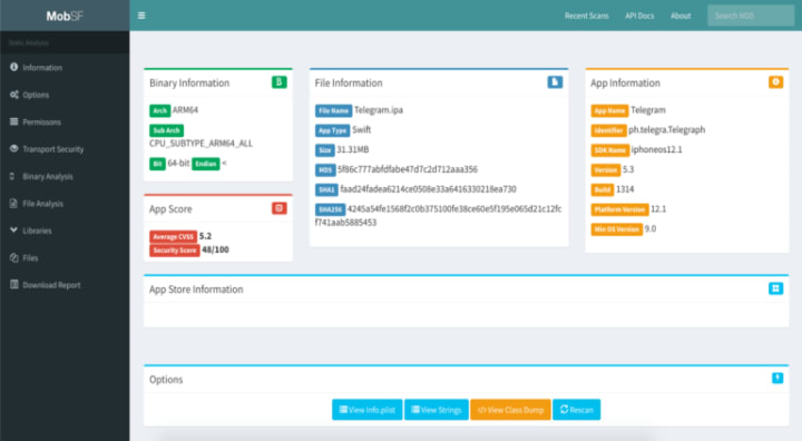 Mobile Security Framework (MobSF) is an automated, all-in-one mobile application (Android/iOS/Windows) pen-testing, malware analysis and security assessment framework capable of performing static and dynamic analysis.