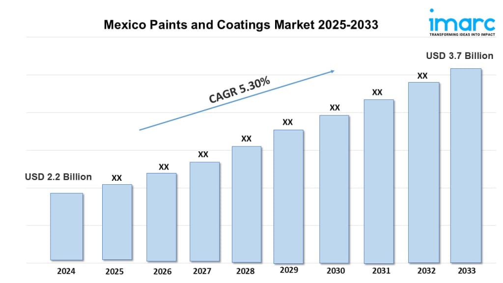 The Mexico paints and coatings market size reached USD 2.2 Billion in 2024. Looking forward, IMARC Group expects the market to reach USD 3.7 Billion by 2033, exhibiting a growth rate (CAGR) of 5.30% during 2025-2033.