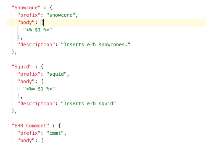 for rails development, edit "erb.json.code-snippets" file.