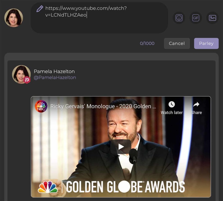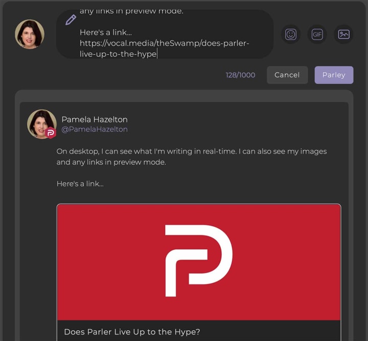 Composing parleys is slicker on desktop than within the app. The desktop browser version of Parler shows you a real-time preview of your post, making it easier to catch mistakes.