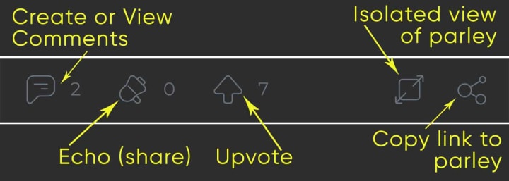 Each parley's footer includes options to comment, echo, and upvote, as well as isolate the parley (bring it forward as a popover) and copy the parley's link for sharing.