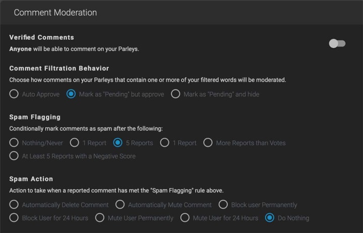 Verified Comments: When off, anyone can comment on your parleys. When on, only verified users can comment.