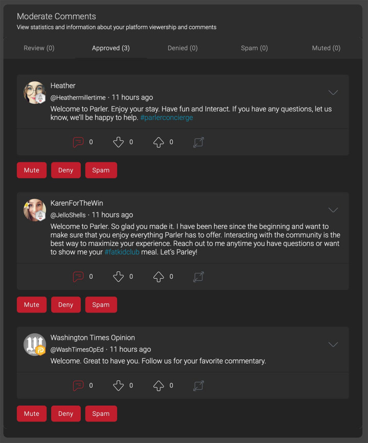 Note that if you told Parler to mark all comments as pending but still approve them, clicking Approve here doesn't do anything. However, you can opt to delete the comment by clicking Deny. Clicking Mute will silence that comment.