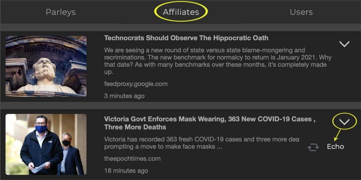 Tap the compass icon to reach the discovery area. Parleys from partners appear, and you can navigate top users and promoted users. Tap the Affiliates tab to read news.