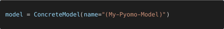 A concrete Pyomo model is created using the above command. Note that the argument 'name' is optional.