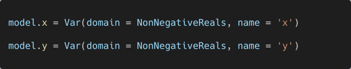 We can also note that we don’t need to include the non-negativity constraints (x ≥ 0, y ≥ 0) because, by default, these are already included in the definition of the decision variables.