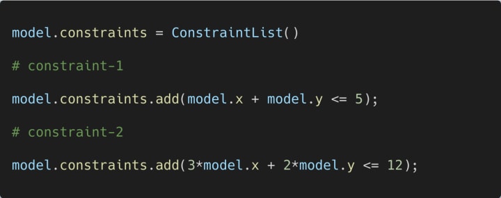 We now add constraints to the model as defined above in the mathematical problem definition. Here, we have two constraints. These can be added to the model as follows:
