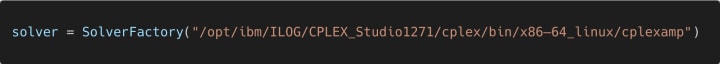 Now, we create a solver. As mentioned above here we use the CPLEX solver. The following command can be used to create a solver: