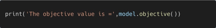 The objective function value can also be retrieved from the obtained solution, as follows: