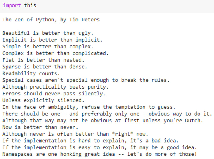 Peters's Zen of Python was included as entry number 20 in the language's official Python Enhancement Proposals, which was released into the public domain. It is also included as an Easter egg in the Python interpreter, which can be displayed by entering import this. To know more, https://www.python.org/dev/peps/pep-0020/.