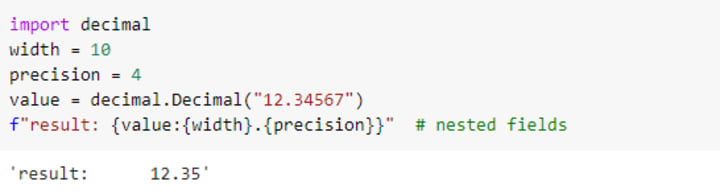 In nested formatted string literals, firstly inner curly brackets which are '{precision}' and '{width}' will take their values so it will become {value:10.4} and lastly value will take the width of 10 and the precision of 4 to give 12.35.