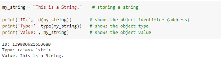 String literals can use single or double quote delimiters. In the below example, the functions id and type give the variable object address and its data type which is 'str' i.e., string in this case.
