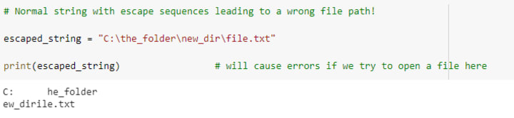 A tab escape character is a backslash \ followed by the t (\t). The \t in the file path "C:\the_folder\new_dir\file.txt" works as a tab escape character.