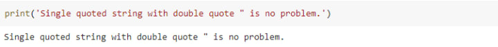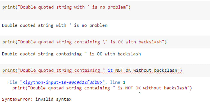 Likewise for double quotes, if you need an actual single quote character inside a literal string delimited by double quotes, you can use the backslash character before the single quote, to tell Python not to terminate the string: