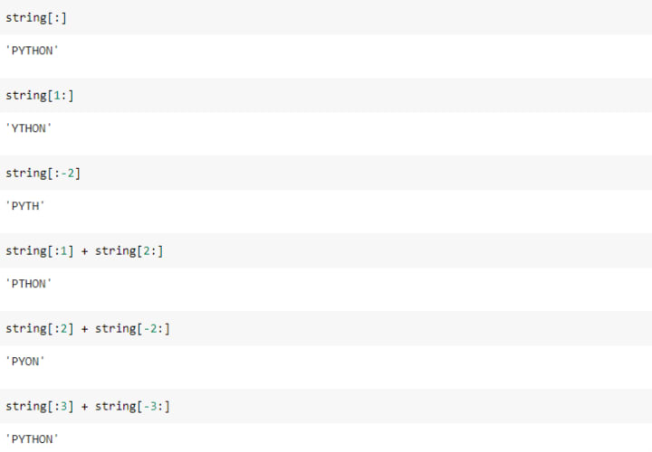 Note: Indexes string with 0 from left side and -1 from the right.