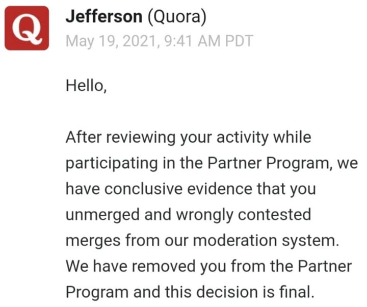 Suddenly my Questions started getting vandalized by merges and Edits by third-party Quora members part of a Space who had a thing for Quora Partners. It was no big deal as I could always revert it and I did but the problems started when after the whole merge/revert procedures 3–4 times, the Quora moderation would pop in and merge the question doesn’t matter how out of the place the merge is.