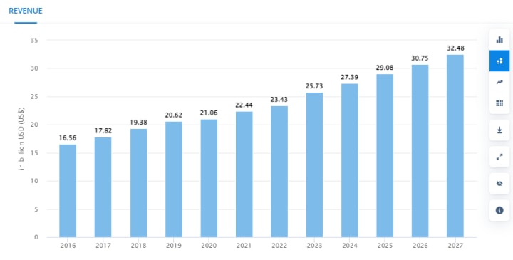 Evidenced by data from Statista which states that Revenue is expected to show an annual growth rate (CAGR 2023-2027) of 6.00%, resulting in a market volume of US$32.48bn by 2027.