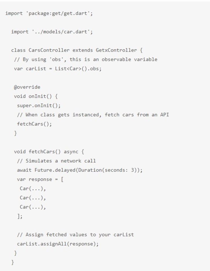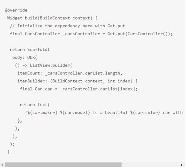 The first unorthodox thing you’ll notice is the initialization of our previously created CarsController. Using simple syntax like Get.put(), we can do the initialization and proceed further.